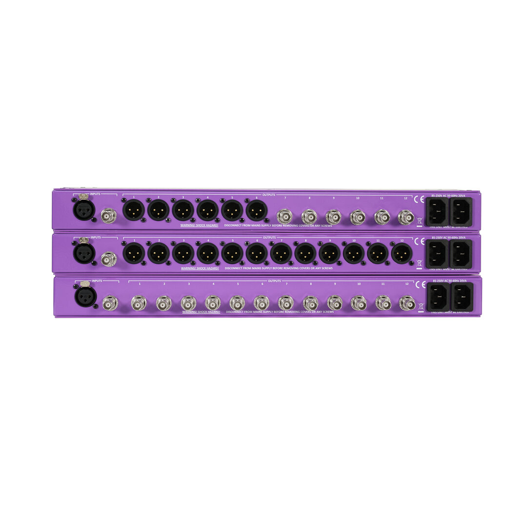 Dostępny jest w 3 wariantach, z wejściami XLR i BNC oraz wyjściami XLR, BNC lub mieszanymi, podobnie jak nasze przetworniki DA z kodem czasowym.